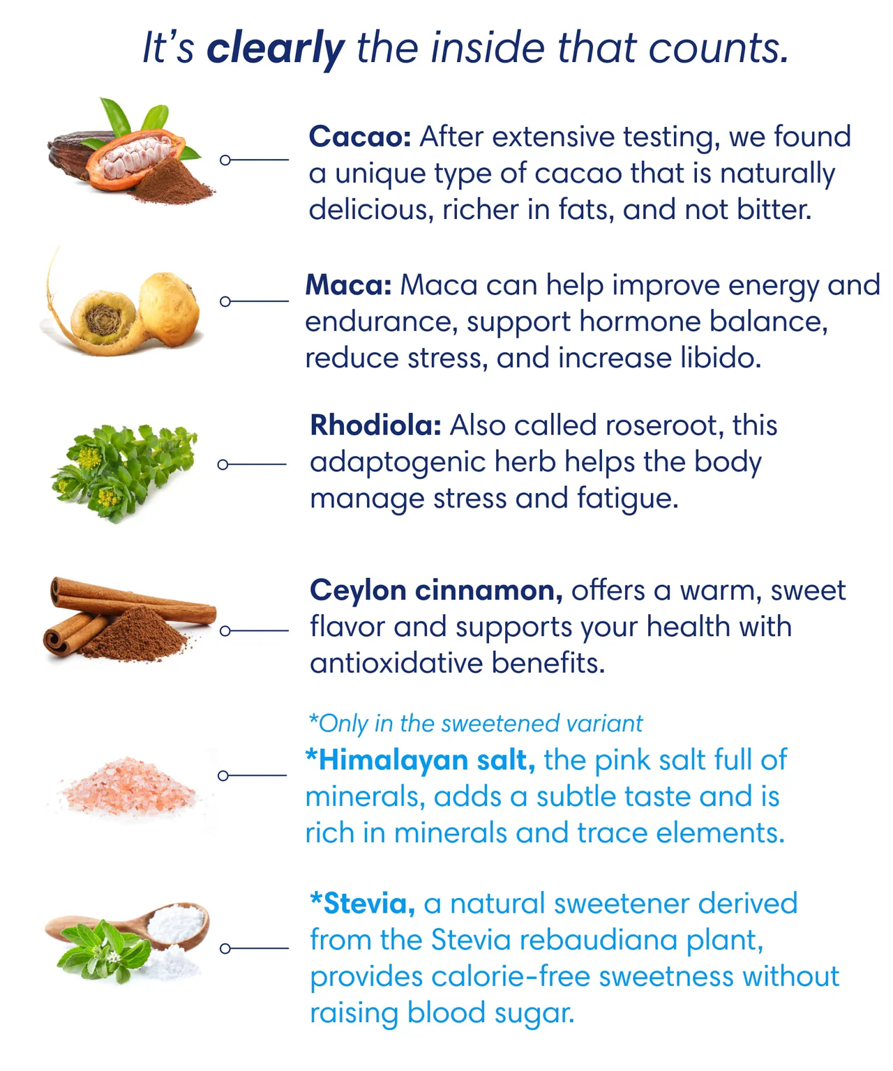 Ambas son 100 % naturales y sin azúcares añadidos. Con una cantidad mínima de cafeína presente de forma natural en el cacao (9 mg), te mantienes enfocado sin sufrir bajones. También dormirás mucho mejor por la noche.