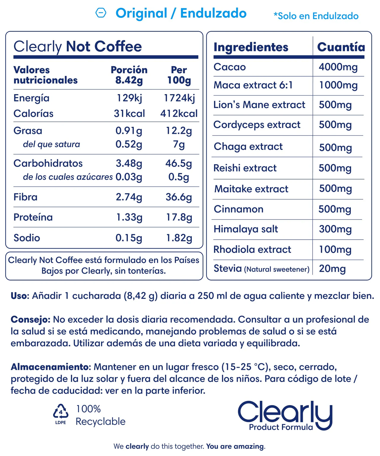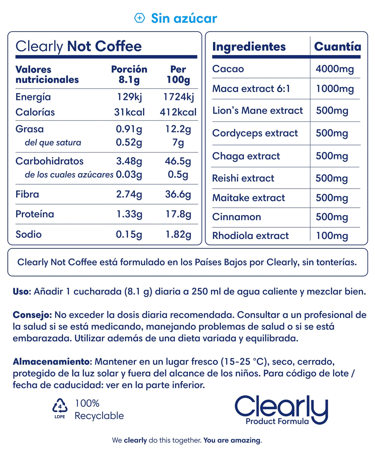 Tras meses de investigación y muchas pruebas, encontramos la combinación perfecta de ingredientes. La base es cacao, complementado con cinco hongos funcionales (Lion’s Mane, Cordyceps, Chaga, Reishi y Maitake), cada uno con beneficios únicos. Además, el maca y la rhodiola aportan un impulso extra para afrontar el día.